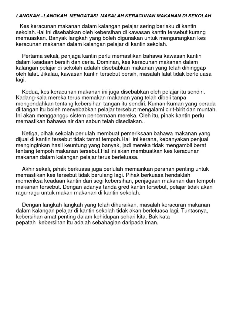 Isi - isi di bawah perlu diolah dengan struktur ayat yang baik mengikut keutamaan. Sebanyak 11226 kes keracunan makanan berlaku di sekolah di seluruh negara dari Januari sehingga 15 September lalu berbanding 5613 kes pada tempoh sama tahun lalu peningkatan lebih 100 peratus. Menteri Kesihatan Datuk Seri Dr.